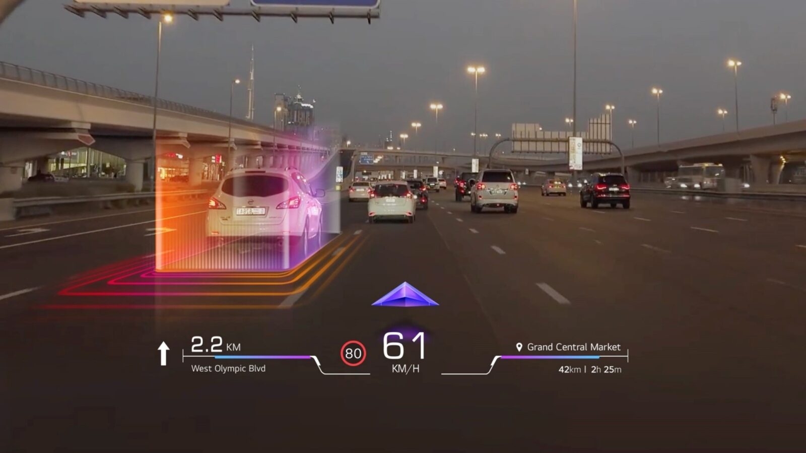 Az LG szabadalmaztatott technológiájának egyik kulcseleme, hogy képes dinamikus AR-képek megjelenítésére. Mindez intuitívabbá teszi az útvonal-ajánlást: a megoldás a közlekedési körülmények alapján valós időben módosítja a járműhöz kapcsolódó információk és az irányt mutató szimbólumok megjelenítését. Az AR által alkalmazott grafikai elemek szétválhatnak, átalakulhatnak és összeolvadhatnak, ennek révén pedig a rendszer a járművezető számára könnyen érthetően, vizuálisan képes megjeleníteni olyan összetett vezetési információkat, mint a sebesség, az út lejtése, a szükséges sávváltások, vagy az útvonal-újratervezések.